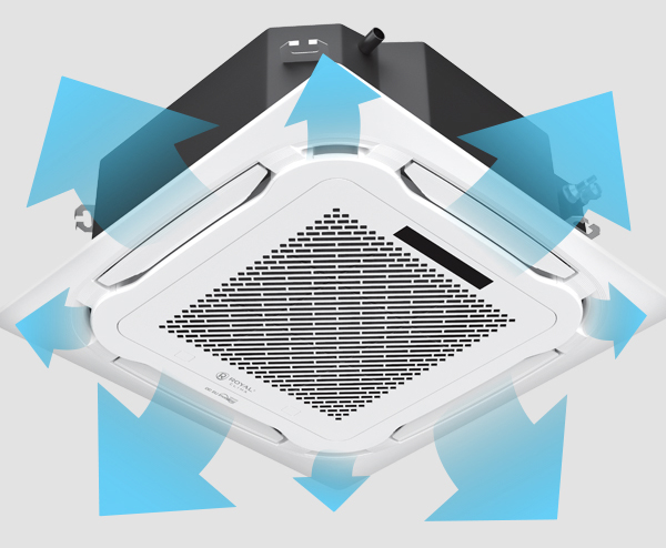 Новый дизайн декоративной панелис круговым потоком воздуха. Кондиционер равномерно распределяет потоки охлажденного воздуха по четырем основным и четырем дополнительным диагональным направлениям.