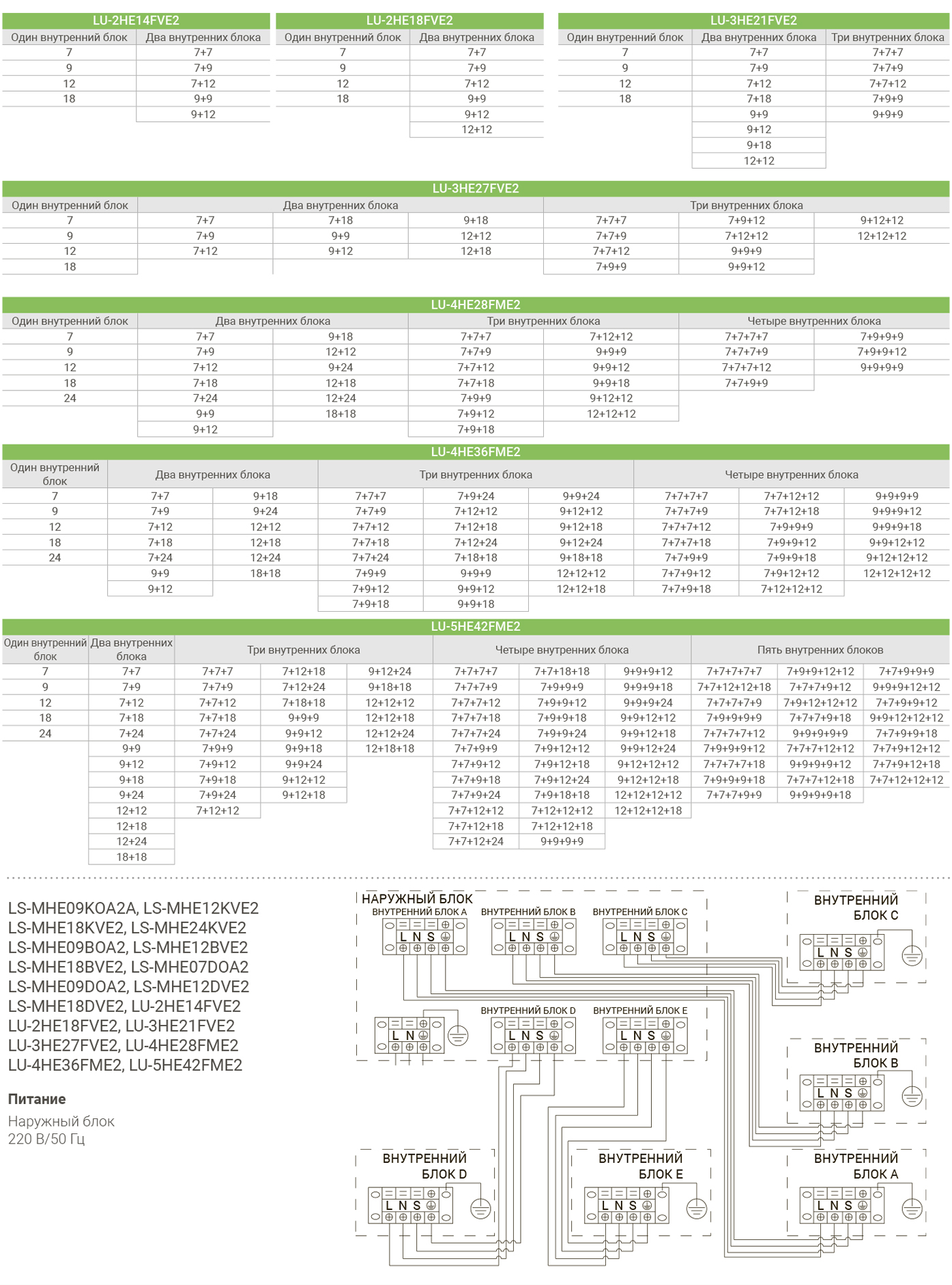 Рассчитан на подключение 2 внутренних блоков. Подобрать внутренние блоки для данной модели можно здесь. Внутренние блоки могут быть настенного, канального, кассетного и напольно-потолочного типа.