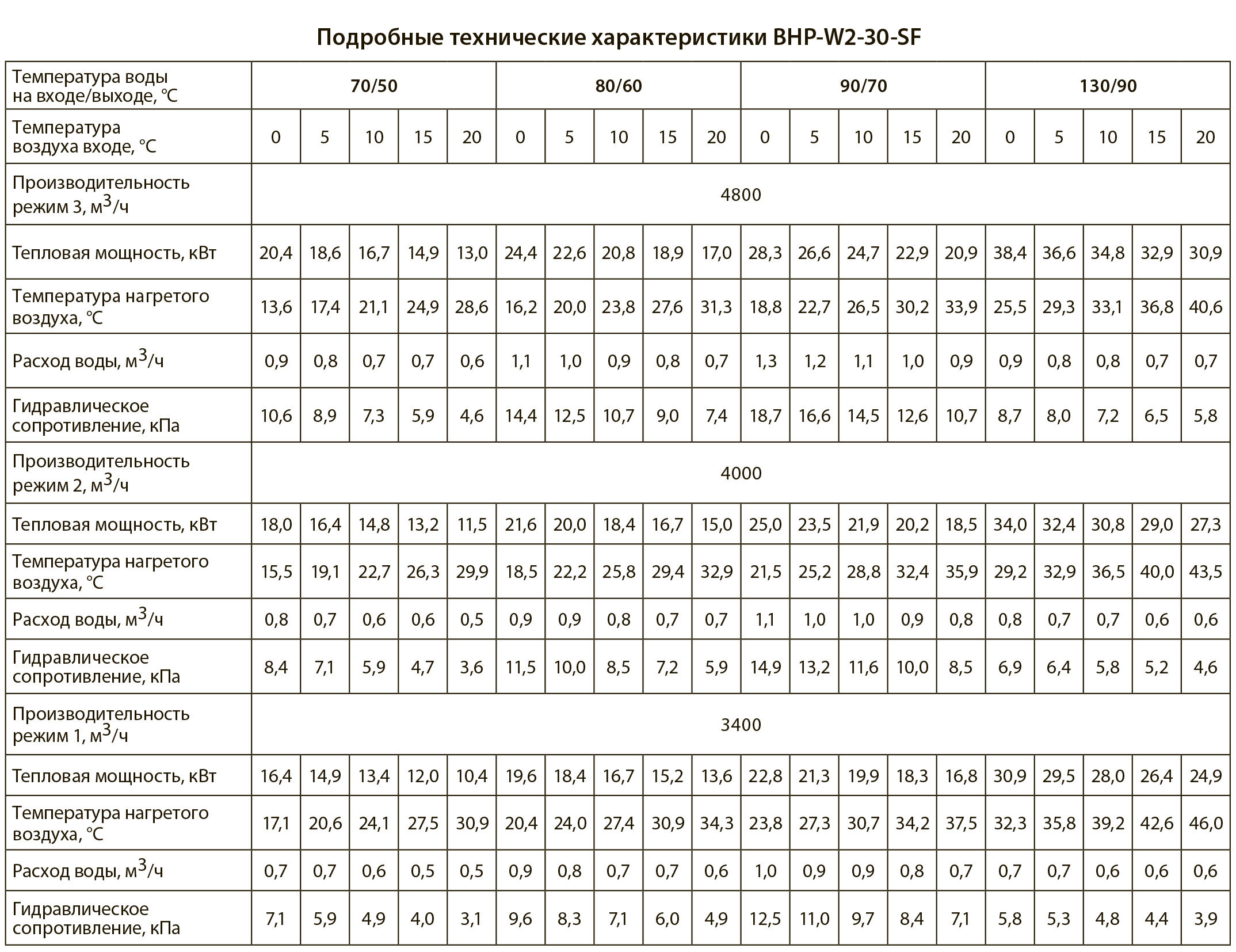 Тепловые характеристики приведены при температуре воздуха на входе +0 °С, максимальном расходе воздуха и максимальной температуре теплоносителя (указанной в таблице тепловой мощности от производителя).