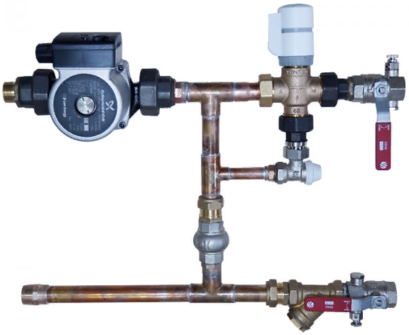 - Не допускать замерзания воды в системе (замерзшая жидкость в теплообменнике может его повредить), для предотвращения подключайте термостат защиты от замораживания совместно со смесительным узлом с насосом