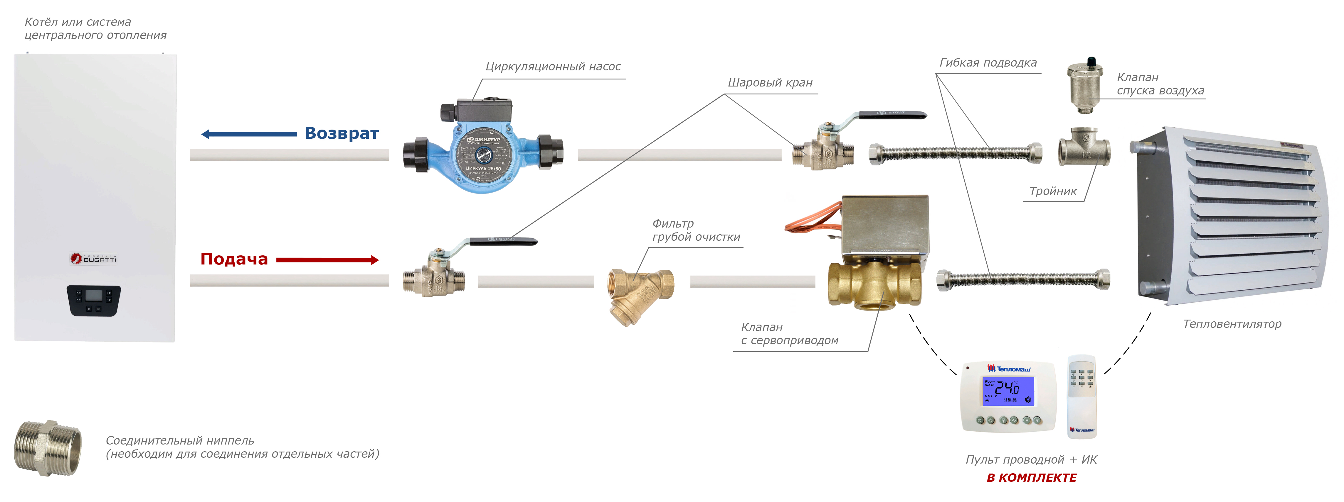 | Металлорукав L=400 Dy 3/4 | Кран шаровой 3/4" | Фильтр сетчатый 3/4" | Угольник 1/2" | Воздухоотводчик автоматический 1/2" | Ниппель 3/4" | Тройник переходной 3/4" х 1/2" х 3/4" |