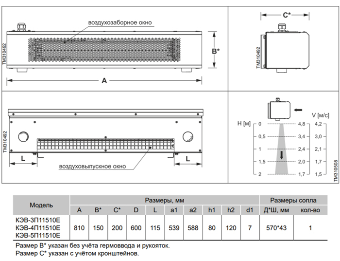 Эффективная длина струи может служить оценкой допустимой ширины или высоты проема, который защищает завеса. При вертикальной установке завес с двух сторон проема, значение, следует понимать как полуширину. Параметр указан только для "мягких" наружных условий, т.е. температура воздуха не опускается ниже 0 °С, а скорость ветра не превышает 1м/с, приточно-вытяжная вентиляция сбалансирована. Любое ужесточение условий уменьшает эффективную длину струи на 50%.