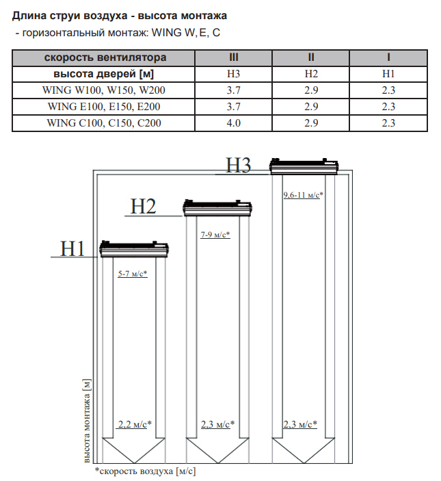 Эффективная длина струи может служить оценкой допустимой ширины или высоты проема, который защищает завеса. При вертикальной установке завес с двух сторон проема, значение, следует понимать как полуширину. Параметр указан только для "мягких" наружных условий, т.е. температура воздуха не опускается ниже 0 °С, а скорость ветра не превышает 1м/с, приточно-вытяжная вентиляция сбалансирована. Любое ужесточение условий уменьшает эффективную длину струи на 50%.