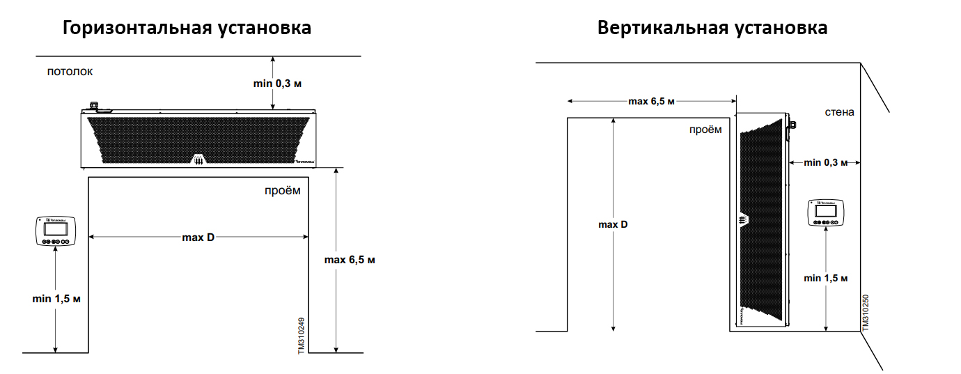 Тепловая завеса, в зависимости от проектного решения может использоваться для защиты как смесительного, так и шиберующего (отсекающего) типа — от прямого контакта с наружным воздухом через открытые двери в холодный период времени. Устанавливается внутри помещения, горизонтально над проемом или вертикально, сбоку от него, как можно ближе к краю. При большой ширине проема можно располагать сразу несколько завес вплотную друг к другу и управлять ими с одного пульта. Подходит для установки в складских помещениях, гостиницах, ресторанах, супермаркетах и др.