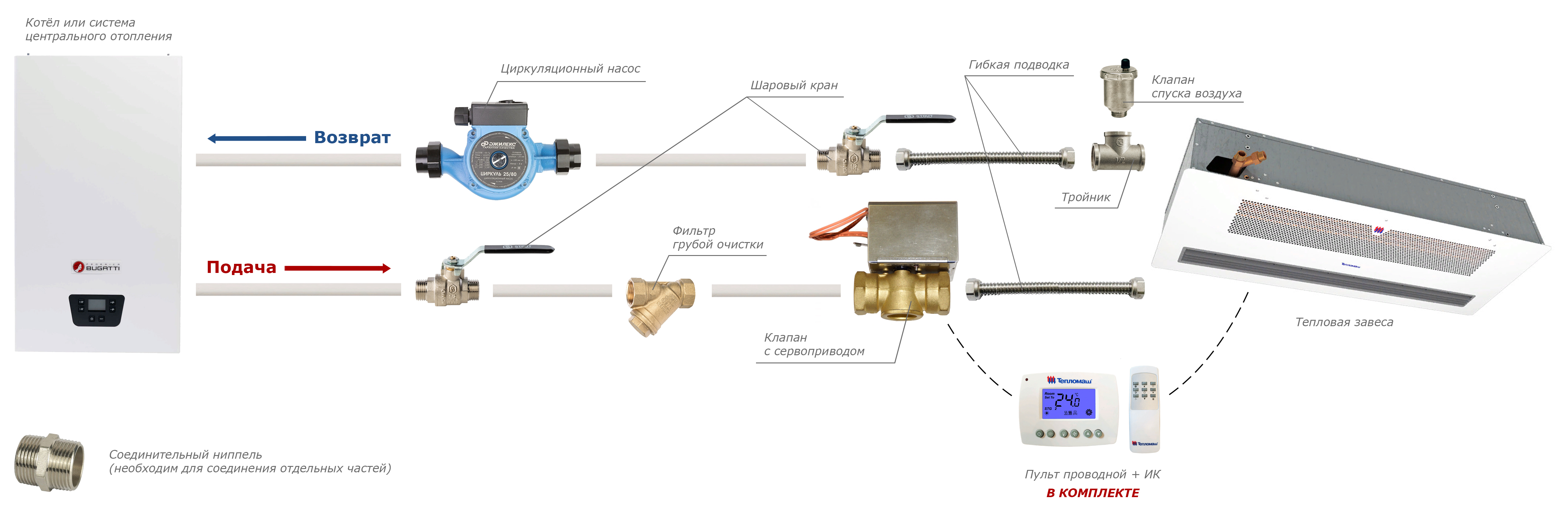 | Металлорукав L=400 Dy 3/4 | Кран шаровой 3/4" | Фильтр сетчатый 3/4" | Угольник 1/2" | Воздухоотводчик автоматический 1/2" | Ниппель 3/4" | Тройник переходной 3/4" х 1/2" х 3/4" |